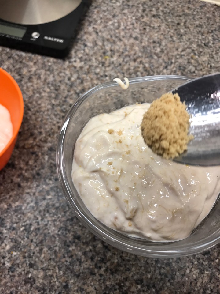 Sprinkle over a little more brown sugar (I skipped this bit for baby’s portion) then pop into the fridge until ready to serve!