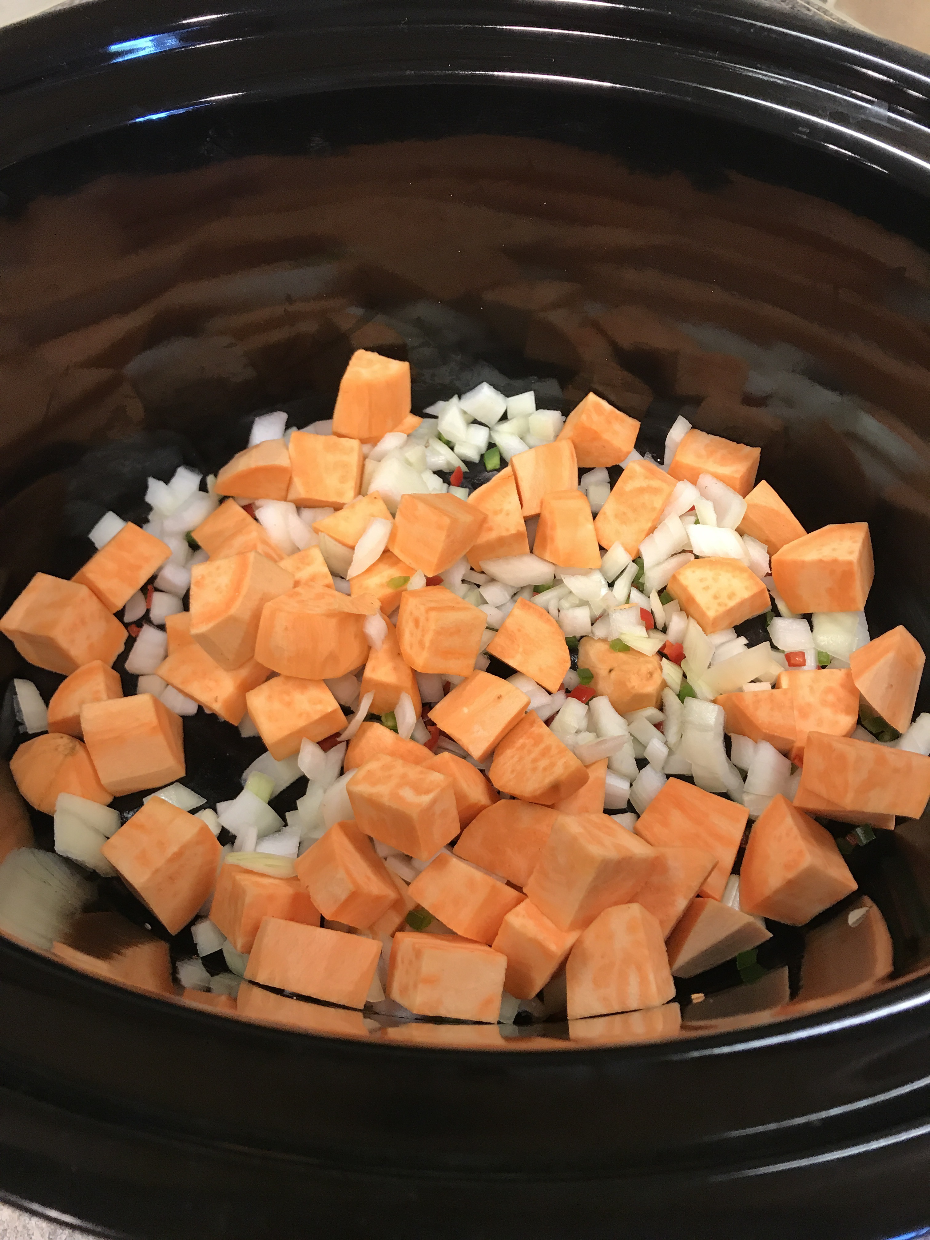 Around an hour or so from the end add the coconut milk and stir through (the sweet potato should be soft enough at this point to break down and thicken the milk.