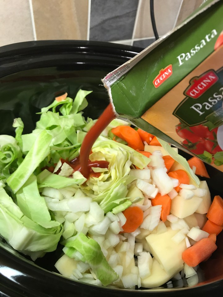 Peel and cut the potatoes into large pieces, peel and chop the carrots into good size chunks, dice the onions, finely chop the garlic and slice the cabbage