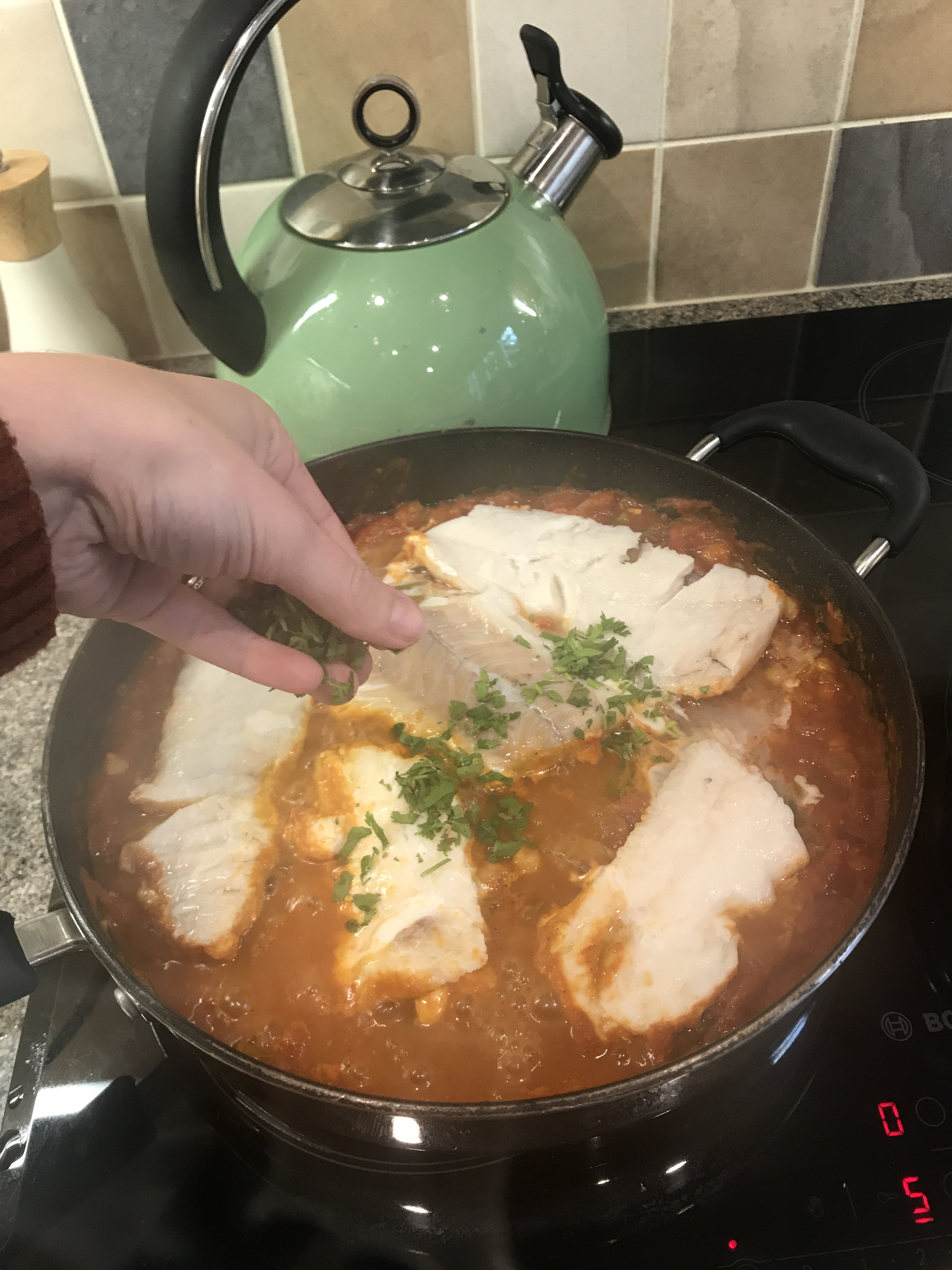 Cover with the lid and cook for around 10mins until the fish is cooked through. If you’re using frozen fish you can either defrost before you start or simply cook from frozen for an extra 5mins or so to make sure it’s cooked through.
