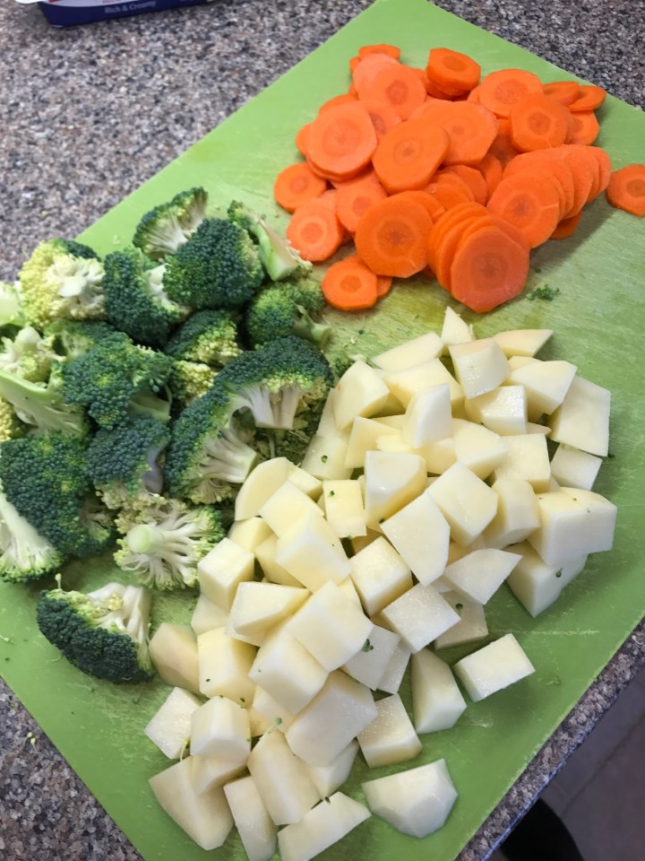 Cut the broccoli into small florets, peel and slice the carrots, peel the potatoes and cut into cubes