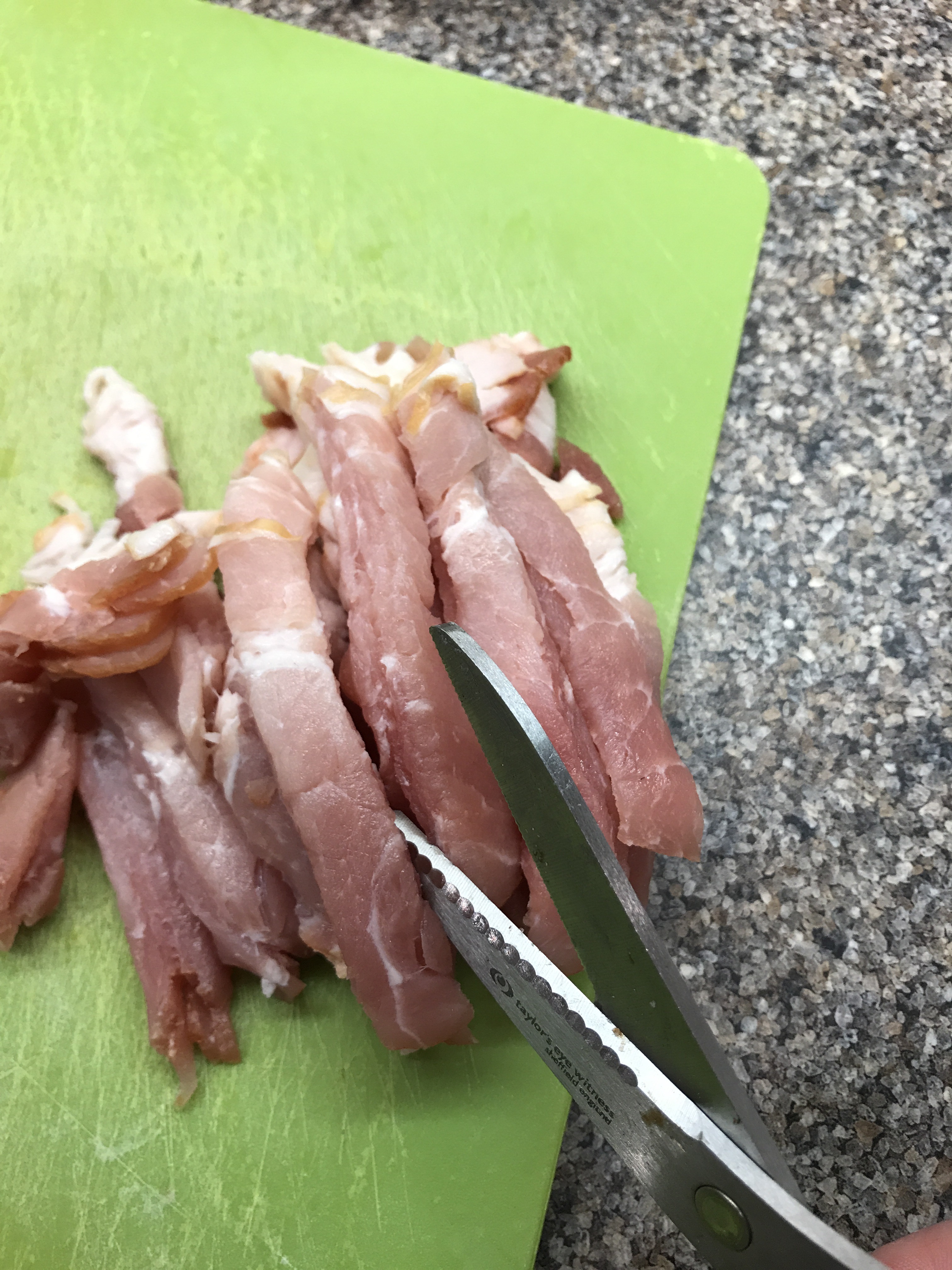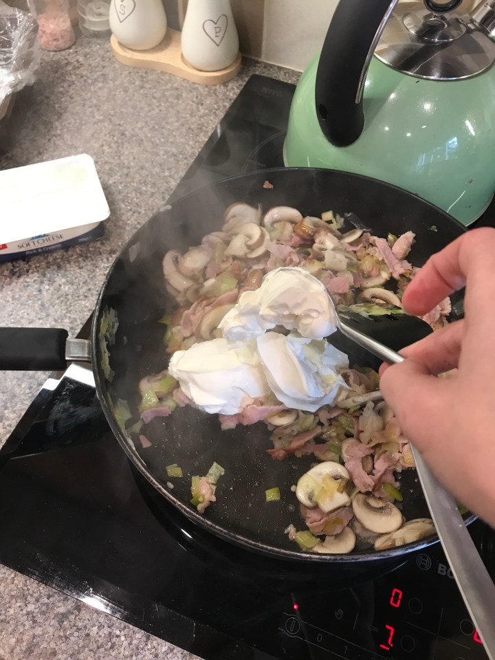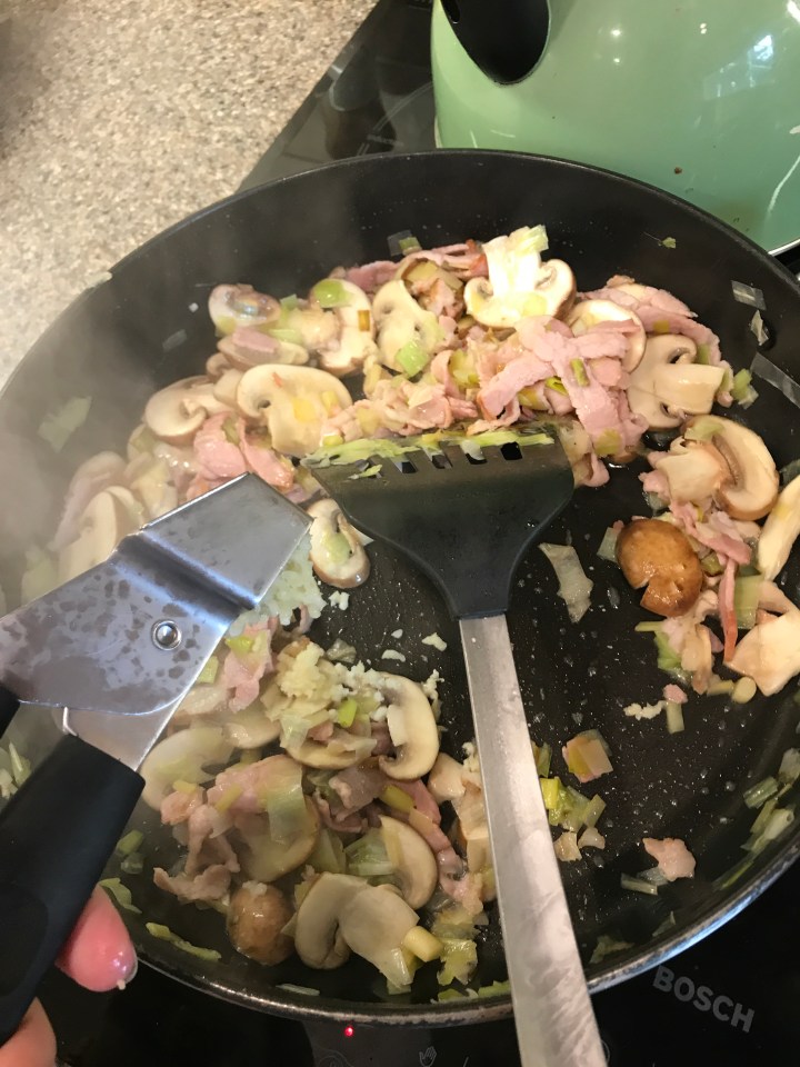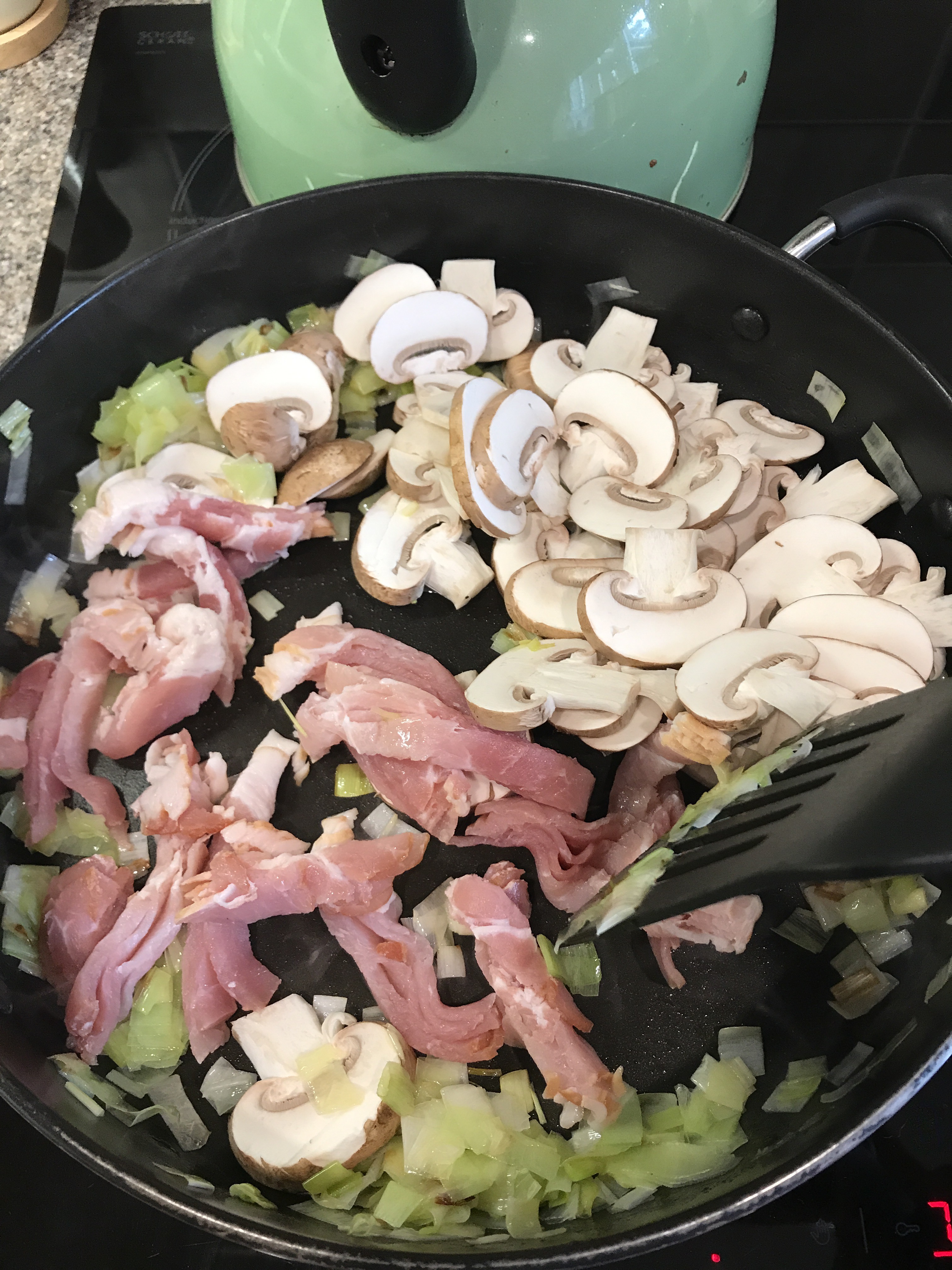 Turn the heat up and add the mushrooms and bacon to the pan. Cook for a couple of minutes