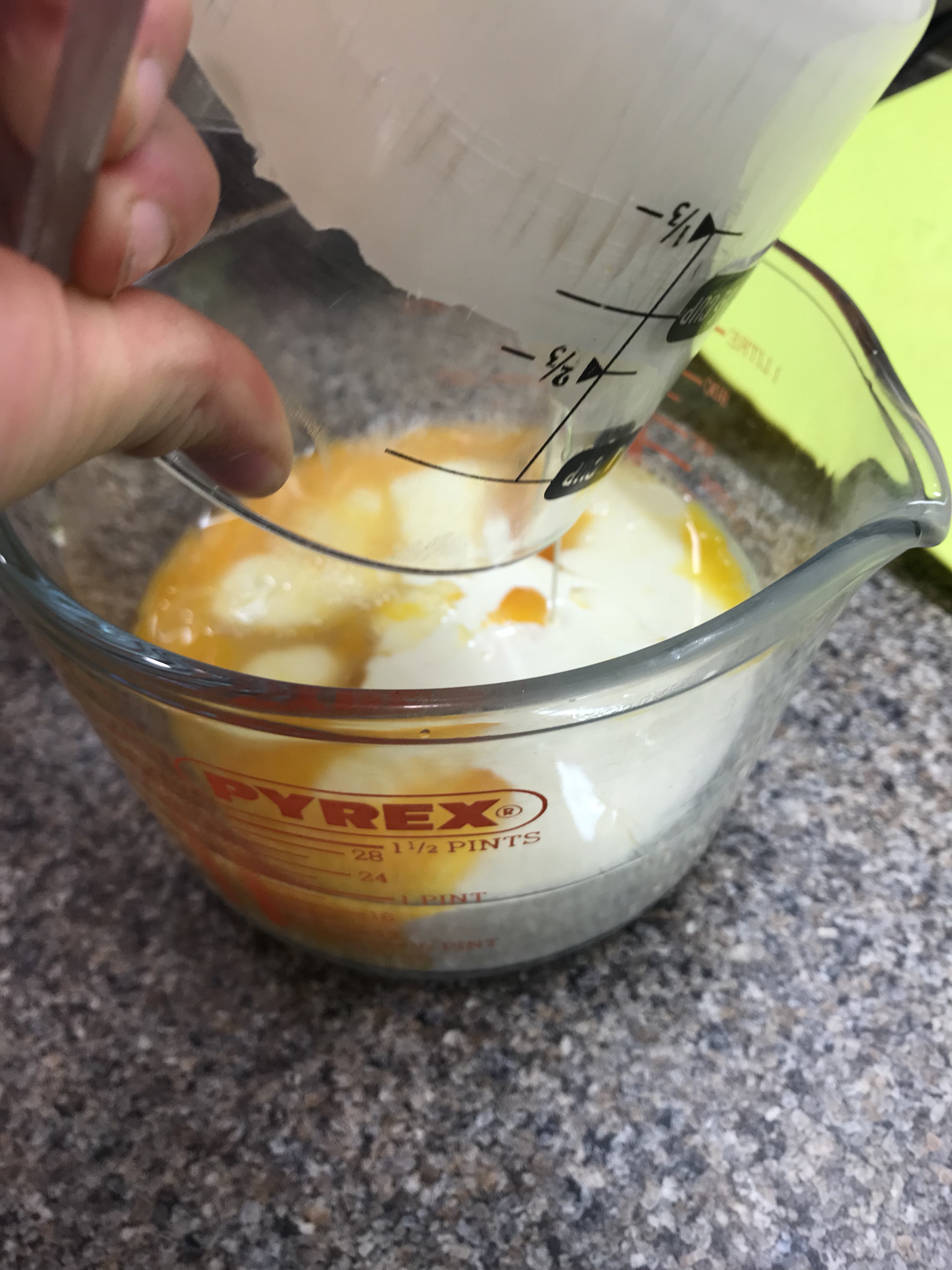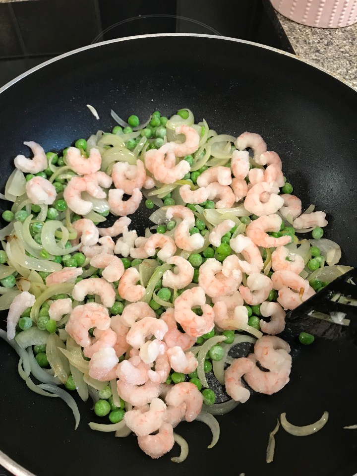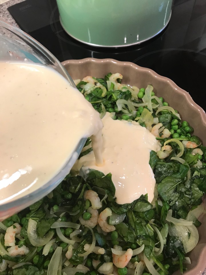 Pour the egg mixture over the prawn & veg until it fills the dish