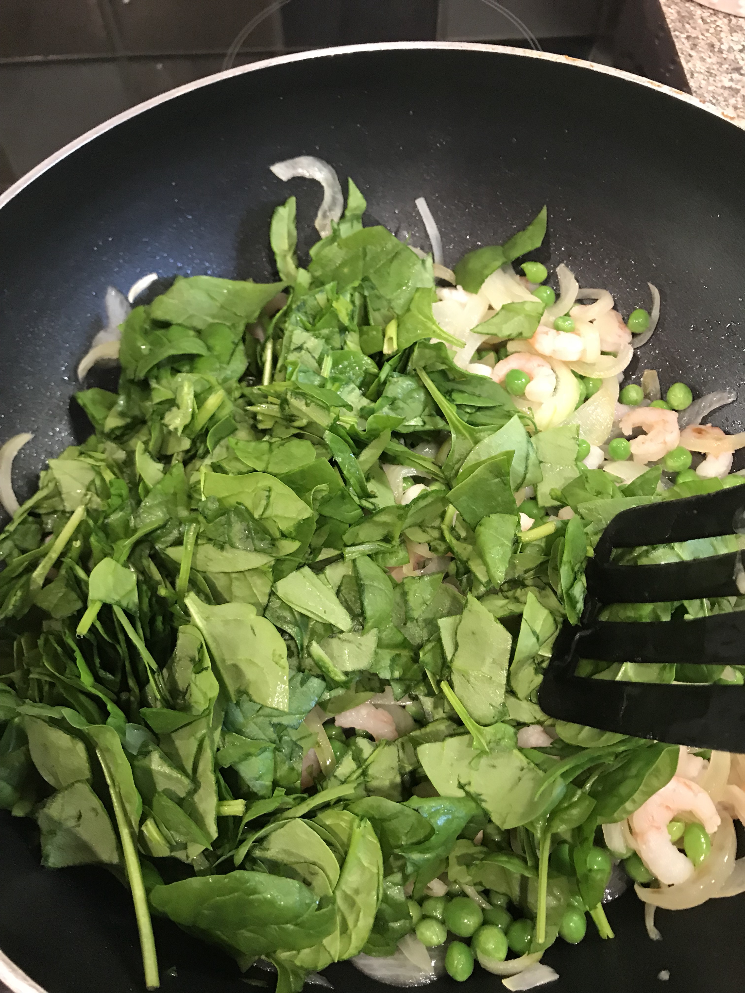 Add it to the pan and cook for 2 mins until it’s just beginning to wilt