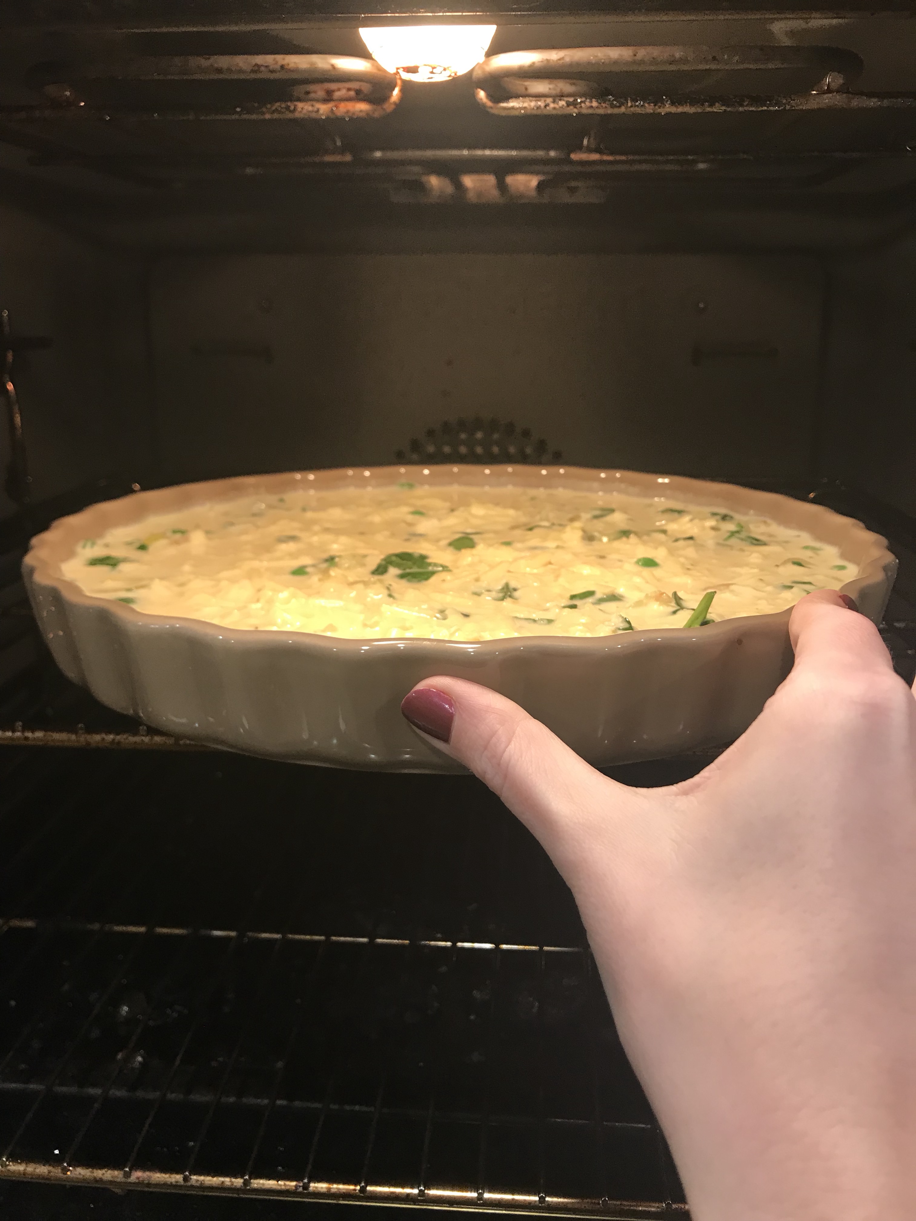 Pour the mixture into a large quiche dish and spread it out as evenly as you can